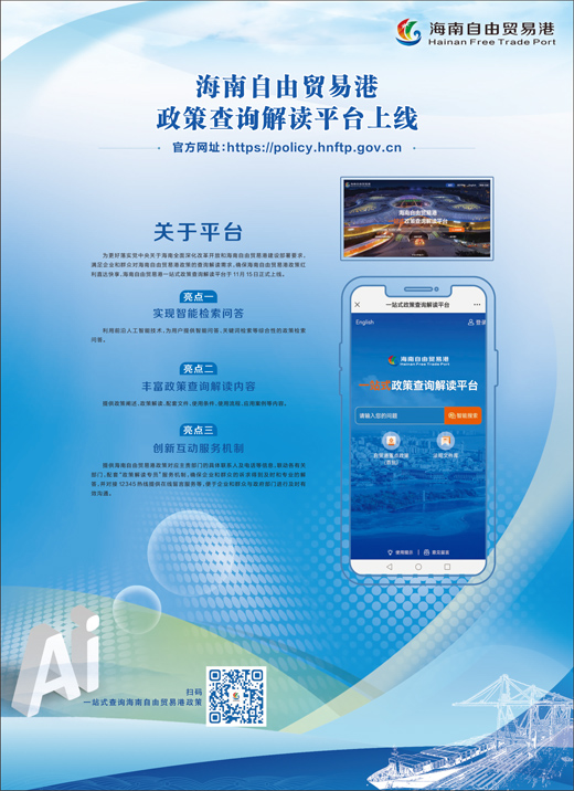 为更好落实党中央关于海南全面深化改革开放和海南自由贸易港建设部署要求,满足企业和群众对海南自由贸易港政策的查询解读需求,确保海南自由贸易港政策红利直达快享,海南自由贸易港一站式政策查询解读平台于11月15日正式上线。
