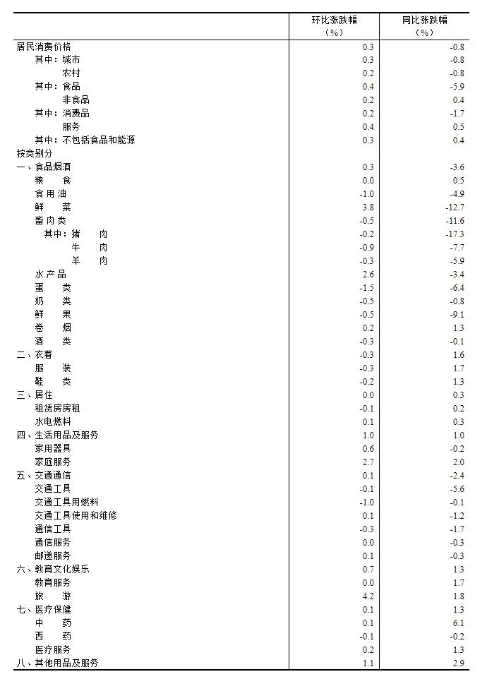 1月份,受上年同期春节错月高基数影响,全国居民消费价格同比下降0.8%。其中,城市下降0.8%,农村下降0.8%;食品价格下降5.9%,非食品价格上涨0.4%;消费品价格下降1.7%,服务价格上涨0.5%。在1月份-0.8%的CPI(居民消费价格指数)同比变动中,翘尾影响约为-1.1个百分点;今年价格变动的新影响约为0.3个百分点。